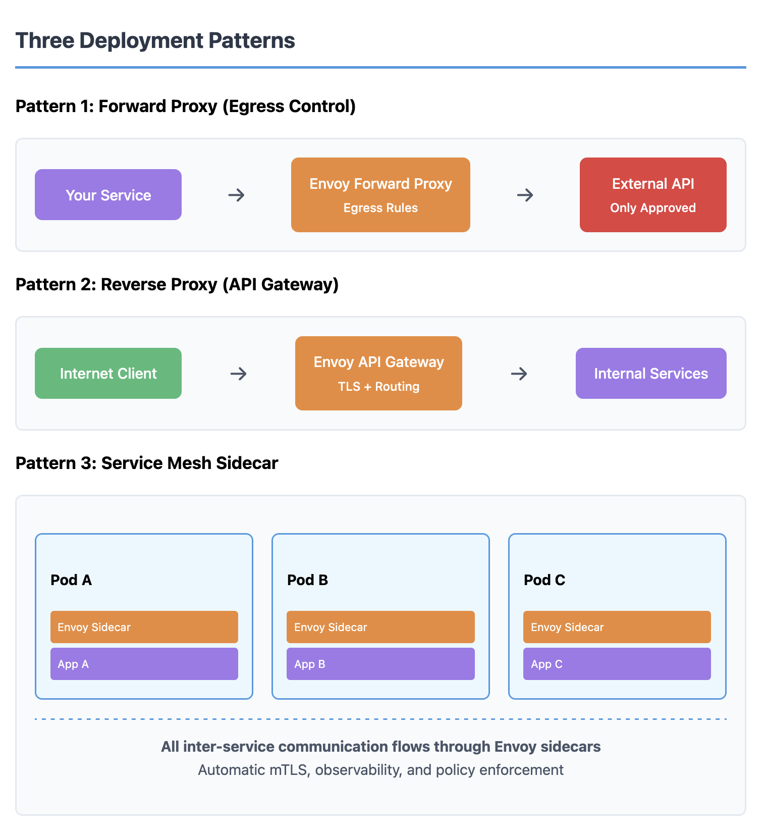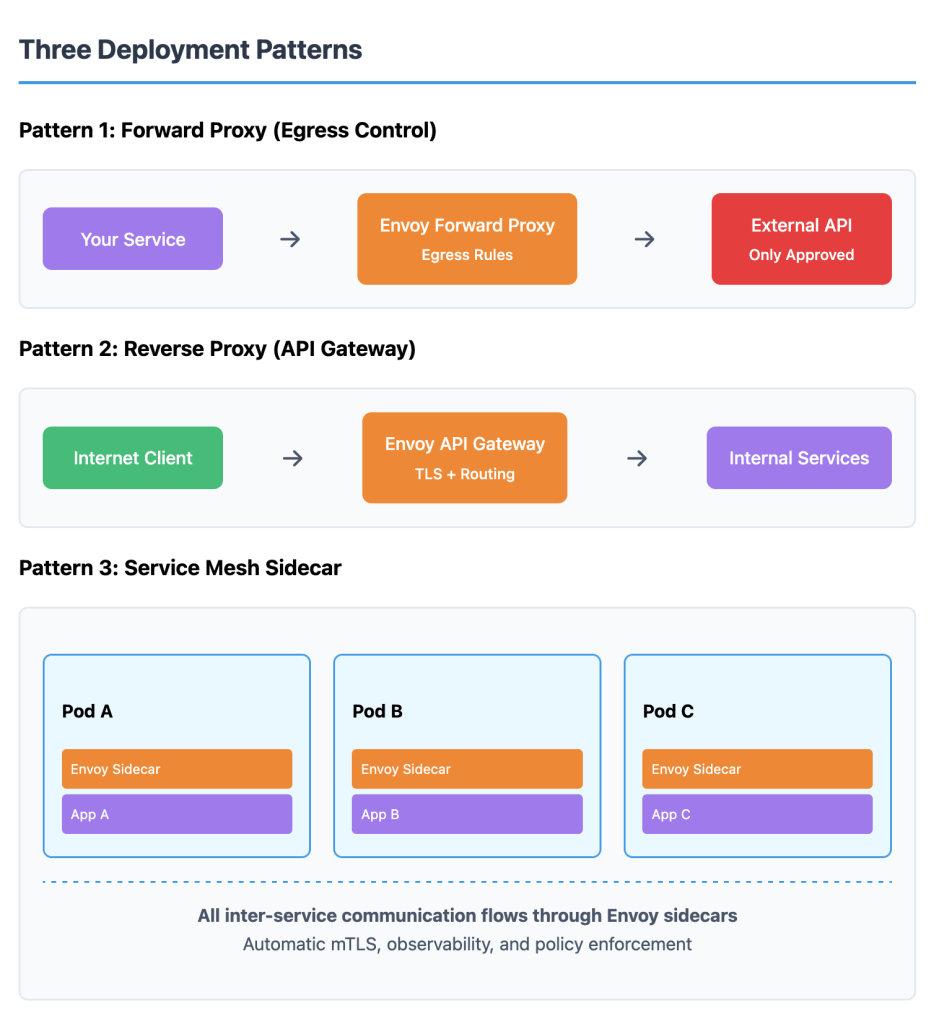 Envoy’s versatility allows it to serve in multiple roles in a cloud-native architecture. We’ll examine three common deployment patterns – Envoy as a forward proxy, as a reverse proxy, and as a sidecar proxy – and see how Envoy adds security and usability in each context.